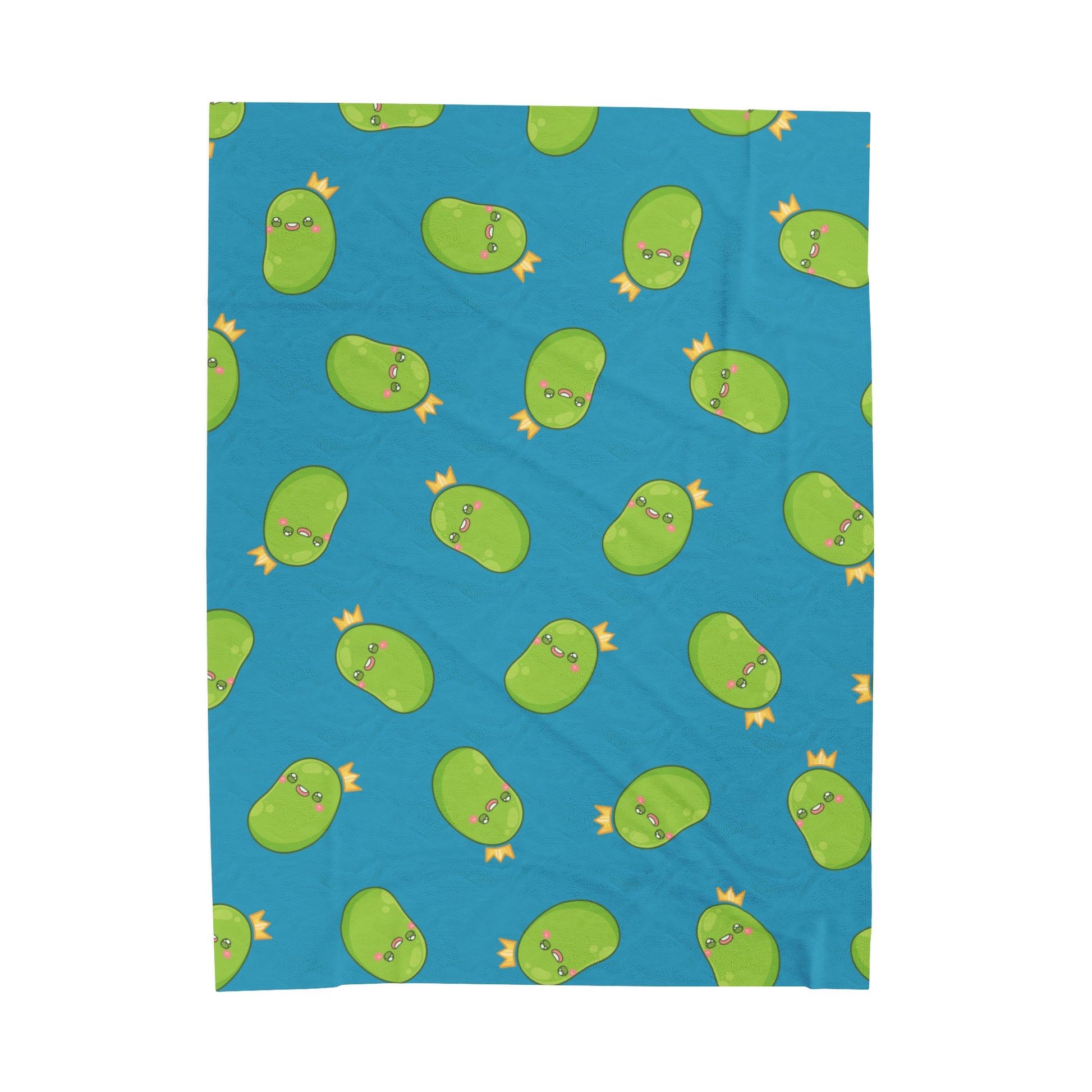 A cozy plush blanket featuring an All Over Print (AOP) of a Happy Bean, perfect for snuggling up on the couch or adding an extra layer of warmth when listening to ASMR!